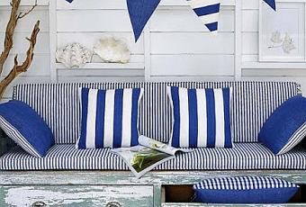 Pequena cabana en azules, celestes y blancos , junto al mar.