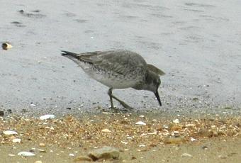 Aquí podemos ver al correlimos gordo junto a otro de los comunes, para comparar, y con ellos uno de los 5-6 vuelvepiedras Arenaria interpres que también encontramos, este a lo suyo y haciendo honor a su nombre...