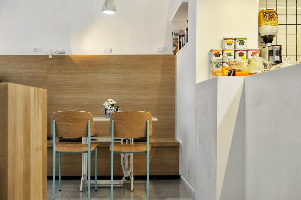 El blanco es el lienzo que se aloja en las paredes dando protagonismo a la madera y a los árboles que hay en el centro lineal del espacio interior.Las mesas son con encimera en mármol blanco y base de máquina de coser antigua y las sillas de diseño dan la guinda a este proyecto en el que las teteras en forma de lámpara son su carta de presentación.