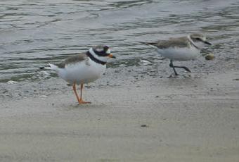 El chorlitejo grande Charadrius hiaticula en cuestión es una hembra, como bien delata su collar estrecho y uniforme, y formaba parte del grupo de 10 aves que se encontraba en la playa. Aquí la tenemos en el momento de sacar una xorra de la arena; los chorlitejos comen preferentemente pequeños bichinos de la superficie pero no le hacen ascos a otros platos.