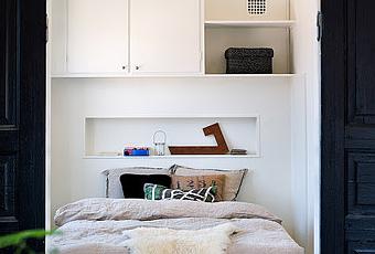 Ante los escasos metros y espacios reducidos, eliminar las mesillas laterales, y crear una repisa en el cabecero es una opción para seguir teniendo a mano todo junto a la cama.