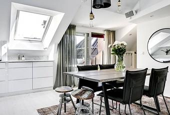 Con 66 m² de planta y un segundo piso de 13 m² este ático puede parecer pequeño, pero la distribución abierta y las ventanas en paredes y techo amplían e iluminan el espacio haciéndolo mucho más grande.