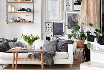 El salón tiene el punto más femenino de este piso nórdico con un par de toques de nude sobre una paleta de blanco y madera clara. Aunque la distribución es algo rara (el dormitorio escaleras arriba y el armario abajo) el espacio está bien aprovechado y el piso es muy amplio para una persona, sin olvidar la terraza que se convierte en el comedor de verano, de fácil acceso desde el salón. ¡Feliz martes!