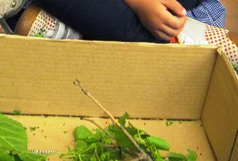 El día que llegaron fue muy emocionante porque eran tan pequeños que casi no los podían ver y todos los niños luchaban por hacerse un hueco y poder remover las hojas para ver dónde estaban. Los vimos por turnos y contamos 8 gusanos. Desde ese día la caja estuvo de lunes a viernes en el rincón de ciencias, disponible para los niños que elegían ese rincón.