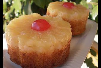 Fué ahí, en mi cocina preparando un simple bizcocho, me llegó “la inspiración”: usar los pequeños y bonitos moldes, rodajas de piña en almibar que una vez abierta la lata no me gusta dejar en el frigorífico y parte de la masa que tenía que preparar, el resultado: unos pastelitos riquisimos que me sorprendieron al sacarlos del horno y ver que se fundieron en una dulce armonía la piña y el bizcocho.