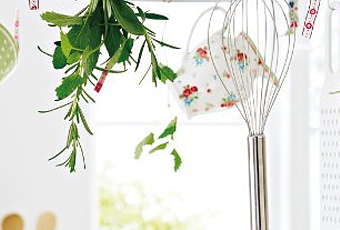 Lo cierto es que somos muchas las personas, hombres y mujeres, que por unos motivos u otros pasamos bastante tiempo en la cocina …. y la verdad, a muchos nos encanta estar allí, rodeado de aromas, sabores, colores y creando a cada comida que preparas … por ello para mi la cocina tiene una importancia especial, tanto así que tengo mi ideal de cocina totalmente gestionado en mi mente… Y son dos las prioridades: Espacio y Luz… manteniendo estas dos claves el resto viene dado solo, pero como os digo ese es mi ideal por que la realidad es que la mayoría de nuestras cocinas no superan los 12 m2 y en cuanto a la luz natural, apenas contamos con una o dos ventanas … pero que no tengamos nuestra cocina ideal no significa que no podamos mejorar la que tenemos … así que he recopilado varias ideas para hacer nuestra cocina mas divertida, fresca, un poco a tono con la estación primavera-verano, ideas sencillas y llenas de carácter como este divertido detalle de hearthandmade.co.uk que encabeza el post, y para el que apenas necesitas un aro de aluminio, cintas para colgarla en el techo, algunos utensilios de cocina y unos ramilletes naturales. Y es que los toques naturales dentro de una vivienda son esenciales, La idea de una pecera con agua y flores colgando también del techo me parece espectacular, claro que no debemos olvidar que lo mas importante es no cubrir el cristal para apreciar su contenido por ello no puedo dejar de compartir un tutorial de theredthreadblog para hacer tu mismo este macrame hanging vase para colgar la pecera en algún lugar con luz de tu cocina, me gusta la idea incluso para colgar la pecera con algún pez … "la vida anima"