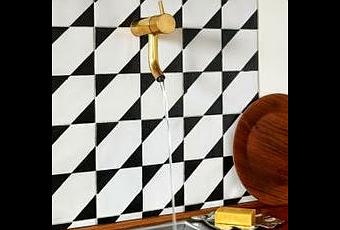 En la cocina justo encima del fregadero podemos colocar un conjunto de baldosas hidráulicas que no tienen porque serlo puedes utilizar restos de alguna obra y adquirir en el conjunto cromático colores que aúnen el espacio por ejemplo aleternando blancos y negros como si de un tablero de ajedrez se tratase y en medio clocar un bonito grifo que puedes instalar en alto para dar altura a una cocina sin mucho espacio esta idea la puedes utilizar en los baños también .(ME ENCANTA ESTA IDEA)