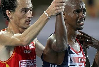 España levanta el brazo de Mo Farah reconociendo su superioridad -EFE. El atletismo es un deporte bastante noble. No es una apreciación de quien escribe esto, sino de Jesús España (Valdemoro, 1978), subcampeón de los 5.000 metros en los Europeos de Barcelona. El atleta español celebró antes el oro de su rival, Mo Farah, que su propia plata. Se abrazó a él y le levantó el brazo en señal de reconocimiento por haber sido mejor en un final explosivo en que, conforme pasaban los segundos, el británico se escapaba un poco más para Jesús España. Ambos se llevan bien y sobre todo se respetan. El español recordó lo duro que había sido para Mo Farah, que también se llevó el oro en los 10.000 metros, perder ante él el oro en los Europeos de Goteborg por nueve centésimas. Esta vez el británico acumuló varios cambios de ritmo en los últimos 1.200 metros y resultó inalcanzable para España, superior a Hayle Ibrahimov, de tan sólo 20 años. 26 tiene Veronique Mang, protagonista de otro gesto maravilloso y que seguro que también comparte la filosofía del medallista español. Mang quedó descalificada de la final de los 200 metros por salir hasta de la cuenta, pero fue la primera en acercarse y envolver con una bandera felicitar a su compatriota Myriam Soumaré, que se marcó un baile en el podio para celebrar su triunfo en la calle 8, por delante de la ucraniana Yelizeveta Bryzhina y la rusa Aleksandra Fedoriva. Gestos que ennoblecen estos Europeos de Barcelona, como la tradición de dar la vuelta de honor en el heptatlón, ganando con brillantez por la británica Jessica Ennis.