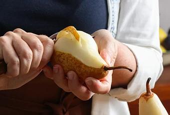 Pelar las Peras, sin quitar el “cavito” y luego cortar la base para lograr que queden paradas sin caerse.