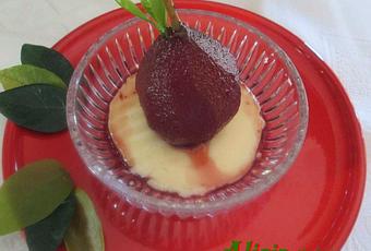 Disponemos en recipientes individuales una capa de crema de vainilla y dejamos un rato en la nevera. Colocamos sobre la base de vainilla una pera, llevamos de nuevo al frigorífico y cuando vayamos a servir salseamos con la reducción de vino.