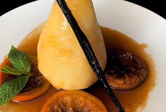 Dejar enfriar todo y servir las peras con el almíbar y el resto de ingredientes.
