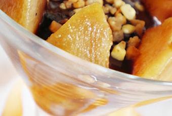 Emplatar: colocar os trozos de pera, regar con el chocolate y esparcir las almendras crocanti.