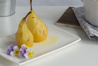 Para las peras 4 peras unas hebras de azafrán 100 g de azúcar zumo de un limón medio litro de vino blanco
