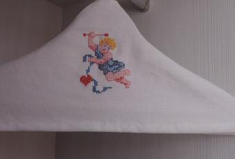 Este bordado lo he utilizado para forrar una percha de madera, la había visto hace tiempo en una revista de punto de cruz, donde explicaban como hacer perchas forradas y con motivos bordados, y la verdad es que me gustaron mucho, y lo tenía en proyectos pendientes de intentar.