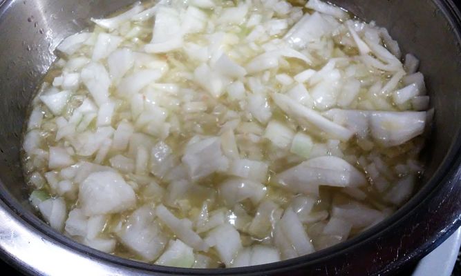 Cuela el aceite y vuelve a ponerlo ( no todo ) en el fondo de la cacerola para el sofreír la cebolla.Pica la cebolla y dora en el aceite.