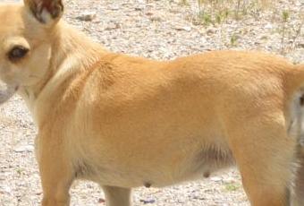 Es una chihuahua con mezcla de caniche de color marrón clarito, con el hocico blanco y las patitas blancas, el rabo corto.