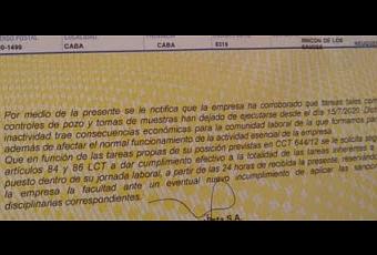 AESA envió Cartas Documento a sus trabajadores exigiendo “el cumplimiento efectivo a la totalidad de las tareas inherentes a su puesto dentro de su jornada laboral, a partir de las 24 horas de recibida” la comunicación y Guillermo Pereyra advirtió que el gremio podría retirarse de la negociación con YPF.En un audio dirigido a los delegados sindicales de AESA, Pereyra señala que “Estuve viendo la carta documento que envía AESA a los compañeros para que sigan rompiéndose el traste laburando con poca gente, sigan en la misma temática, que se van al carajo, que suban la gente a trabajar que realmente corresponde y no tengan la gente en la casa, explotándolos a todos ustedes”.