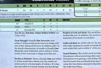 Según esta imagen, Ghazghkull ahora es una verdadera maquina de matar, en todos los sentidos! Ya que su perfil y sus reglas recuerdan mas a los de un Dread que a los de un personaje de "karne y huezo", aunque con reglas como Prophet of Gork & Mork tiene todo lo bueno de uno y otro y nada de malo (No puede perder mas de 4 heridas por fase!).