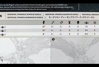 Por lo visto los cambios son bastante significativos y le benefician. Por ejemplo, la R pasa de 7 a 8 ,o la A 6 a 7.Mas cambios:El daño de Golpe Evicerador de Silencio pasa de 1d6 a 1d3+3 y Linterna pasa de alcance 18" a 12" ( 30 cm, en vez de 45 cm, si no he calculado mal). De todas formas no son reglas completas y faltan cosas, pero... por lo menos con esto esta claro que a Mortarion lo han mejorado bastante de cara a esta nueva edición.