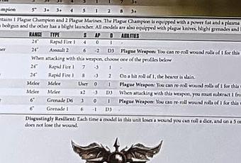 Acabo de ver estas cosas en Faeit 212. Por un lado tenemos desde la web de Spikey Bits el perfil completo filtrado de los nuevos marines de plaga en 8ª y a la verdad es que están bastante bien, la verdad, de momento, aunque no tenemos los costes en puntos. Lo que mas le ha llamado a la gente la atención es ese nuevo lanzagranadas de plaga (Blight Launcher) que es un arma excelente, a mi entender. Va de perlas para acabar con unidades resistentes, en especial si no tienen mucha armadura pero si bastantes heridas y resistencia. Me gusta, me hare con unas cuantas en su momento aunque sea usando lanzagranadas de la G.I...