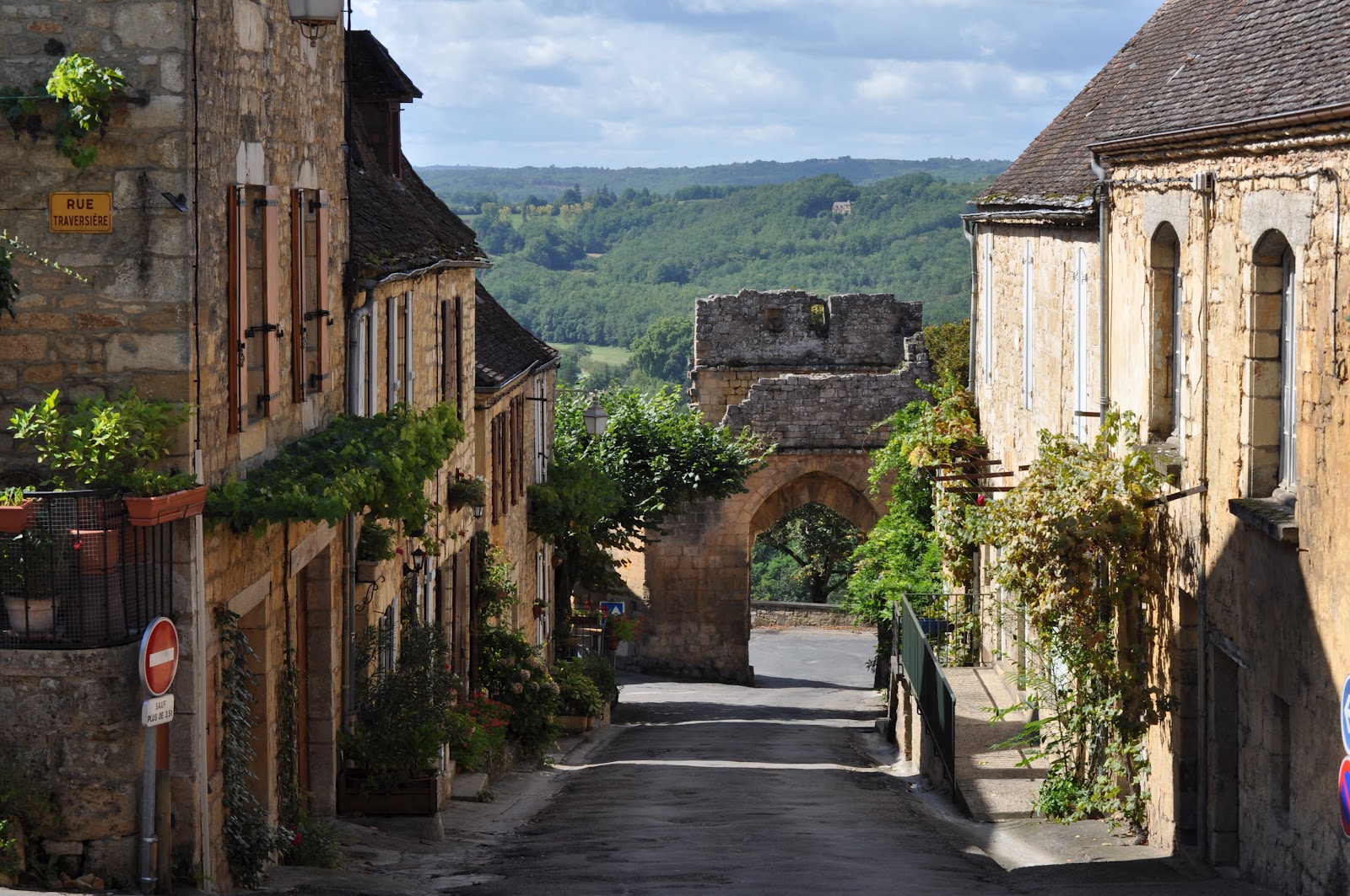 La primera parada la hicimos en Dome, pueblo fortificado o bastide. Conserva tres de las antiguas puertas a la ciudad, el mercado cubierto del siglo XVII y varios edificios de época anterior, como la del Gobernador, en la plaza de la Halle. Pero sobre todo esto lo que mas nos gustó fue su situación, encaramado en lo alto de la montaña disfruta de unas vistas preciosas del rio y su valle.