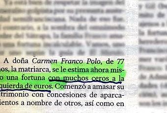 Como véis, hoy la noticia no tiene nada que ver con médicos ni con enfemedades. Tiene que ver con la economía de la viuda de Franco que, según este periodista, está en la ruina, porque tener una fortuna con muchos ceros a la izquierda no es que sea algo muy valioso precisamente... Me da a mí que el periodista, además de ser de Letras y no llevarse muy bien con los números, tampoco le tenía mucho aprecio a la familia de Franco... Por no mencionar la frase con muchos ceros a la izquierda de euros, que anda que no suena mal... Va a resultar que el periodista más que franquista era republicano, vamos, de izquierdas, de ahí la confusión con la colocación de los ceros...