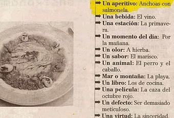 En este caso se trata de un pequeño test que alguien, no sabemos quién, ha respondido. Pero lo que sí sabemos es que esa persona o el periodista o tal vez los dos tienen unos gustos culinarios un poco especiales... Nada más y nada menos que anchoas con salmonela y eso que le gustan los libros de cocina, que si no... Mira que a mí me gustan las anchoas y las he probado con cogollos de lechuga, en ensalada, rebozadas, en vinagre, en salazón, al ajillo... pero con salmonela, nunca. Aunque, pensándolo bien, eso de que las anchoas lleven ya incorporada la salmonela puede ser una buena forma de cogerse una baja o perder peso en unos pocos días...