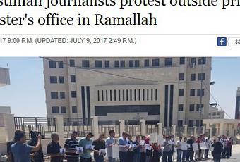 Decenas de periodistas palestinos organizaron una protesta fuera de la oficina del primer ministro palestino en Ramallah el sábado , la protesta se produjo después de que las fuerzas de la AP arrestaran a Jihad Barakat el jueves, periodista que trabaja para el canal de televisión con sede en Beirut, Palestine Today.