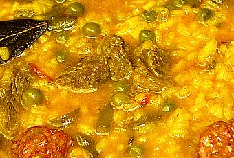 350 Gr. de arroz 400 Gr, de carne de cerdo 250 Gr. de judías verdes y guisantes 2 Chorizos 1 Tomate grande 1 Pimiento verde 3 Dientes de ajo 250 Ml de vino blanco de Aguilar 60 Ml de aceite de oliva de Aguilar 1 y ½ Litros de agua 1 Pastilla de caldo de ave Laurel, colorante y sal