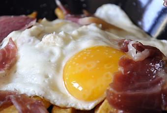 - Montamos nuestro perol: ponemos una cama de patatas, encima las lonchas de jamón y sobre todo el huevo. Y tenemos una cena super rica y rápida o un aperitivo chachi