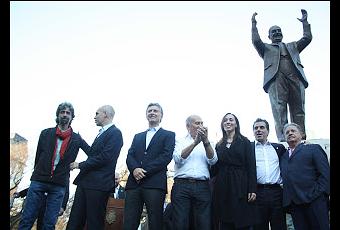 El PJ de la Capital Federal llamó luego a un acto de desagravio a la figura del General por la conducción de Macri en el acto. Doblemente, entonces, el 8 de octubre de 2015, al cumplirse 120 años del nacimiento del inspirador del peronismo será recordado: por el monumento y por haberlo inaugurado un no peronista que, en campaña hacia la presidencia, hasta se animó a pedir los votos del PJ para las elecciones del 25 de octubre.En el escenarioestuvieron los sindicalistas Hugo Moyano y Gerónimo Venega, el expresidente Eduardo Duhalde, Ritondo y la cúpula del gobierno porteño que integran Macri, María Eugenia Vidal y la dupla electa Horacio Rodriguez-Diego Santilli.“Todos unidos triunfaremos. Los invito a que nos pongamos a trabajar para que el 10 de diciembre empiece una etapa maravillosa de la Argentina, la tarea de transformar para que todos tengan su lugar y entendamos la importancia de la unidad y de trabajar para lograr de la pobreza cero y echar al narcotráfico que es flagelo de nuestras familias”, se animó Macri.