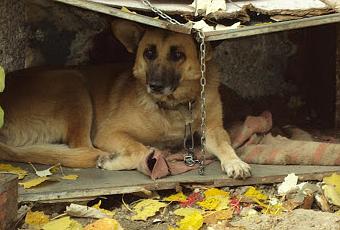 Dafne. Esta pobre perrita vive día y noche atada a una cortisima cadena, dentro de una especie de choza asquerosa, con el agua totalmente verde y en