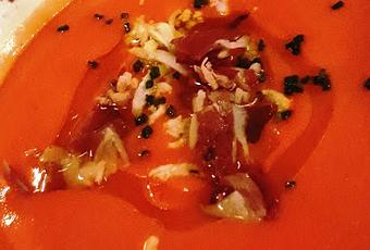 Eso si, la comida es buena. Siempre está todo perfecto. Nosotros empezamos la comida con un salmorejo y unas originales tostaditas mexicanas con ropa vieja y mole poblano.