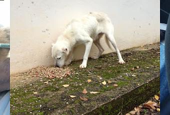 Esta perrita está abandonada en la Sierra de Segura en Jaén, lleva muchos días sin moverse de la zona. Está en los huesos y las orejas las tiene cortadas como a navaja, le hemos echado pienso y la pobre no levantaba la cabeza, se ha puesto a comer con desesperación.
