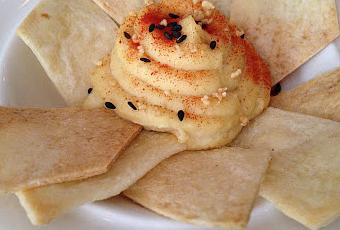 Fuimos los cuatro cual familia feliz, guiados por las sugerencias de mi hermano: dos ensaladas de pollo, dos perritos falderos, y dos "perriburguers". Mientras esperaban nos trajeron un pequeño aperitivo, sencillo, pero delicioso, hummus (el corrector me pone "humus") con unas tostaditas de pan que nos supo a gloria. Y no habiamos terminado el hummus, cuando llegaron las ensaladas. ¡Qué ensaladas señores! Parece que todo está más que inventado, y sin embargo, nos sorprendió muy gratamente. Un fondo de lechugas (sí, de la siempre presente Florette, o similar) con tomatitos cherrys, lascas de queso, croutons bien hermosos y caseros y trozos irregulares de pollo con un rebozado crujiente. Y digo irregulares y quiero decir naturales y caseros, de esos que coges la pechuga y la cortas en tiras, lo que hace que nunca haya dos iguales. Todo aliñado con una suave vinagreta de mostaza y miel, deliciosa.