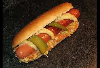 Ingredientes:- 2 panes para perritos.- 2 salchichas grandes.- Unas hojas de col o berza.- Zanahoria rallada.- Pepinillos grandes.- Un trozo de queso cremoso tipo camembert.- 1 cucharadita de mostaza.- 1 cucharadita de kétchup. - 1 cucharadita de mayonesa.