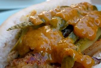 ♥ 1 taza de gluten de trigo♥ ½ taza de agua o caldo vegetal♥ ¼ taza de vino blanco♥ 1 cebolla picada♥ 2 dientes de ajo picados♥ 2 cucharadas de harina de trigo♥ 2 cucharadas de pan rallado♥ 2 cucharadas de jugo de limón♥ 2 cucharadas de orégano♥ 1 cucharada de mostaza dulce♥ 1 cucharada de humo líquido♥ ½ cucharadita de azúcar♥ ½ cucharadita de pimienta♥ ½ cucharadita de sal♥ ½ cucharadita de comino molido♥ 2 cucharadas de aceite de oliva♥ pan de perritos sin ingredientes de origen animal♥ pepinillos laminados♥ cebolla frita♥ mostaza dulce