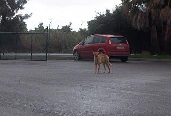 Abandonado, no se como ha llegado hasta alli pero llevara dos semanas dentro de un recinto. Es tamaño grande, no se que raza o cruce es, es macho y se ve jovencito.
