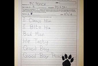 Tras la persecución y posterior detención de un delincuente, la fiscalía británica pidió una declaración escrita y firmada del agente que participó en dicha detención, explicando lo que había sucedido, se le informó que el agente que intervino era un perro policía, no era un ser humano, pero la fiscalía seguía en su tesitura de reclamar dicha declaración, tras informarles varias veces de que el agente Peach es un perro y a fiscalía hacer caso omiso, se procedió a presentar la declaración requerida. La foto de la declaración fue retirada de los perfiles de las redes sociales de los agentes para evitar mofas sobre este asunto. Fuente: http://blogs.20minutos.es/becario/2013/02/21/obligan-a-un-perro-policia-a-escribir-y-firmar-un-informe/