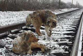 El leal can se quedó dos días junto a una perra que estaba herida en unas vías de ferrocarril en Ucrania.