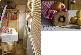 A. Comencé situando un reflector blanco frente a la fuente de luz que procedía de la ventana. Un esquema clásico que empleo en la fotografía de still life. Si hubiera utilizado un reflector plateado, el efecto del mismo hubiera sido demasiado potente, y poco natural (más sobre reflectores aquí). Con el reflector blanco se evitan sombras y se refleja bastante luz, pero no me acerco al claroscuro que estoy buscando. Este es un tipo de luz agradable, aumentando un poquito la exposición, pero bastante plano. Por cierto, el término SOOC ya sabéis que se refiere a Straight Out Of Camera (directamente salido de la cámara).