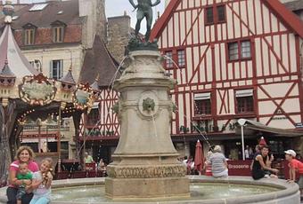 Un poco mas adelante nos topamos con el edificio de correos en la Plaza Grangier cuyo espacio, había sido ocupado en su antigüedad por una fortaleza. Llegamos al Mercado de Abastos, mas tarde supimos que este mercado se construyo donde antiguamente estaba el convento de los Jacobinos. A pocos metros llegamos a una de las plazas mas bonitas de la ciudad, la Plaza François Rude ( plaza del Bareuzai) en el centro, nos encanto una bella fuente con un vendimiador colocado junto en lo alto, además de un viejo tiovivo que los peques dieron buena cuenta.