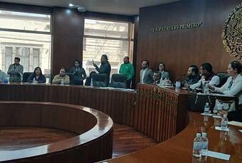 Durante la sesión de la Comisión de Puntos Constitucionales, realizada en el auditorio “Manuel Gómez Morín”, los trabajadores ingresaron para exponer su pliego petitorio al diputado Héctor Serrano Cortés, presidente de la Junta de Coordinación Política (JUCOPO), tras finalizar la reunión legislativa. En representación de los quejosos, Juan Carlos Gómez Gallegos, asesor legislativo, señaló que han sostenido tres reuniones con la titular de la Oficialía Mayor del Poder Legislativo, Dolores Eliza García Román, sin lograr una respuesta favorable; la funcionaria argumenta que la solución depende del Oficial Mayor del Poder Ejecutivo, Noé Lara Enríquez, sin que haya avances en más de un mes.