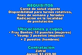 Lea con Atención !!Al Final de la Publicación Está el Acceso al Registro...Brindamos la Información Como nos Gusta Recibirla...Inscripciones 24/11/2025 hasta el 08/12/2025Cantidad de Puestos: 15DETALLES DEL ANUNCIO DE EMPLEO👀La Intendencia de Río Negro abre inscripciones para 15 puestos zafrales de mantenimiento y limpieza de espacios públicos.📍 Ubicaciones y cupos:• Fray Bentos: 10 puestos (mujeres)• Young: 3 puestos (mujeres) + 2 puestos (hombres)