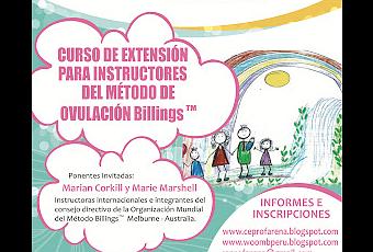Expertas australianas explicarán técnicas y nuevos estudios en la materiaLIMA, (ZENIT.org).- En continuidad con sus 31 años de experiencia en la formación de esposos y consejeros de la planificación natural de la familia, el Centro de Promoción Familiar y Regulación Natural de la Fertilidad (CEPROFARENA) del Perú organiza el Programa de Extensión del Método de Ovulación Billings (MOB), que se realizará en Lima del 15 al 19 de agosto, bajo la conducción de las directoras de la Organización Mundial del Método Billings de Melbourne, Australia, Senior Teachers Marian Corkill y Marie Marshell.