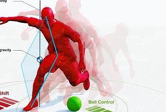 El nuevo enfoque de PES se centra en el balón, usando un concepto llamado física de “baricentro”. Controlas el equilibrio y cuerpo de tu jugador, incluso cuando no está tocando bola. El radio de control del jugador es tres veces mayor que en PES 2013, permitiendo toques manuales precisos. Un anticipio de animación, en ’wireframe’, muestra un jugador recibiendo un pase alto con el exterior de la bota y girándose 180º mientras balancea la pelota en el aire, todo bajo control directo.