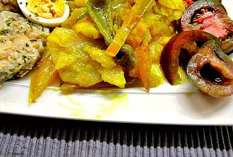 Cuando esté casi hecha sacamos parte del aceite de oliva de la sartén y subimos el fuego para dorar la patata al tiempo que añadimos las guindillas y media cucharilla de cúrcuma, rehogando todo.Los Kumatos, compuestos simplemente con aceite de olive virgen extraq y unas chispas de sal gorda.
