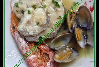 Ponemos un poco de aceite en la cubeta, programamos menú turbo, doramos el ajo y el perejil, añadimos la pescadillas pasada por un poquito de almidón de maíz, agregamos el vino blanco, las almejas y por último los gambones y dejamos que reduzca un poco con la tapa abierta, cancelamos el programa, tapamos con válvula cerrada, programa presión, 130º, presión 3, 5 minutos, cuando termine despresurizamos y servimos.