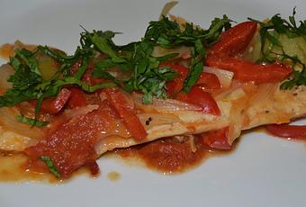 Una vez listo poner el pescado y encima de este la cebolla con el ají, el resto del tomate y el vinagre.