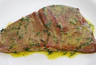 Ahora colocaremos los filetes de pescado en un plato y los aderezaremos con el aliño que acabamos de preparar.